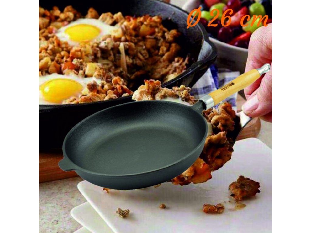 Materiál:Liatina, drevo, kov Nepriľnavý povrch Priemer: 26 cm Dĺžka s uškom: 19 cm Výška: 4 cm Váha: 2,16 kg Nepoužívajte pre odstránenie nečistôt agresívne umývacie prostriedky alebo "drôtenku". Nenamáčate do vody. Použitie a ošetrovanie liatinového riadu Príprava pred prvým použitím : Liatinový riad pred prvým použitím starostlivo umyte v čistej, horúcej vode. Nepoužívajte saponáty, ani hrubé umývacie pomôcky/drôtenka/. Ideálna je mäkká kefa na riady, alebo jemná hubka. Umyté liatinové riady ihneď poriadne osušte. Potom vnútorný povrch riadov dôkladne potrite rastlinným olejom bez pridanej soli. Môžete použiť aj stužený tuk, ktorý rozotriete po vnútornej strane riadu, necháte ho prehriať a prebytočný tuk zlejete. Pre dosiahnutie ideálneho efektu sa môže tento postup pred prvým použitím 2-3x zopakovať. Nakoniec vytrite riady papierovou utierkou. Správne pripravený liatinový riad bude dokonale nepriľnavý. Riady udržiavajte stále mierne mastné, podporujete tým ich nepriľnavosť a zároveň zabránite prípadnému vzniku korózie. Používanie liatinového riadu: Liatina je veľmi odolný materiál. Preto je možné používať aj kovové kuchynské náčinie bez obáv z poškodenia povrchu. Prírodná liatina znesie veľmi vysoké teploty, preto ju môžete používať aj na otvorenom ohni. Ale vyvarujte sa prudkých zmien teplôt, aby nedošlo k narušeniu štruktúry /prípadne až popraskaniu /materiálu. Neumiestňujte ani liatinové riady priamo na rozpálený sporák, pred použitím je vhodné ich predhriať v rúre. Ohrievajte ich pomaly asi minútu a pol. Liatinové riady sú krehké, dávajte preto pozor na pády, alebo prudké nárazy. Čistenie a skladovanie liatinového riadu: Prírodná liatina je porézny materiál, ktorý môže podliehať korózii. Na jej čistenie nepoužívajte žiadne chemické prostriedky (saponáty, prášok, ...), ani hrubé nástroje. Po použití obyčajne stačí liatinové riady vytrieť papierovou utierkou, případně umyť v čistej horúcej vode pomocou jemnej kefky alebo mäkkej hubky. Neumývajte liatinové riady v umývačke riadu! Agresívne čistiace prostriedky a vlhké prostredie spôsobujú povrchovú koróziu liatinového riadu. Ak riady z čistej liatiny používate iba zriedkavo, doporučujeme ich zakonzervovať pomocou oleja/viď vyššie/. Skladujte ich v suchom a teplom prostredí. V prípade, že na riadoch objavíte vrstvičku hrdze, je to dôsledok nesprávneho a nedokonale ošetreného povrchu. Nie je to závada, ani škodlivý jav. Stačí hrdzu šetrne odstrániť. Ak na liatinového riadu spozorujete hrdzové miesta, nalejte troška ocot a pomocou jemnej kefky alebo mäkkej húbky dá sa hrdzu šetrne odstrániť. Potom umyť sa znovu dôkladne natrieť olejom podľa postupu, uvedeného vyššie. Pri dodržiavaní týchto zásad vám liatinový riad bude slúžiť vynikajúco po mnoho desiatok rokov. Ba čo viac, častým používaním sa jeho vlastnosti budú ešte zlepšovaťDodatočné parametre