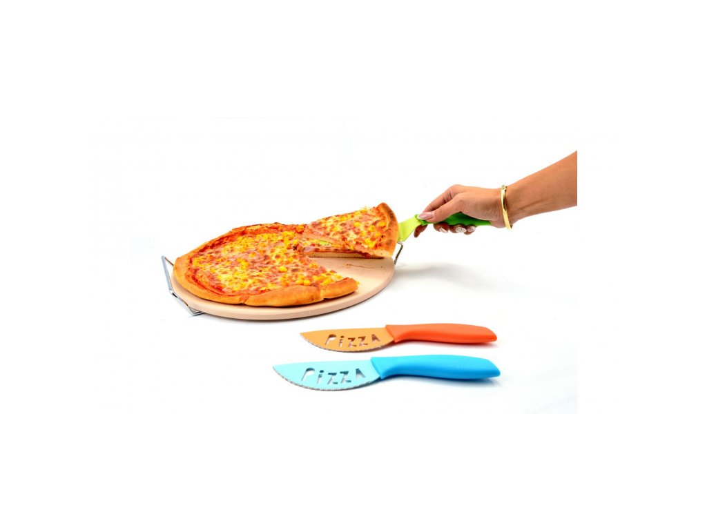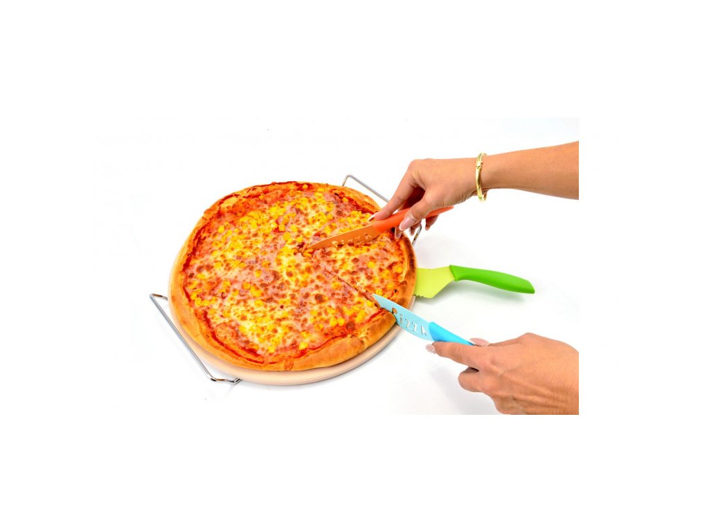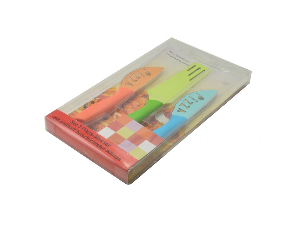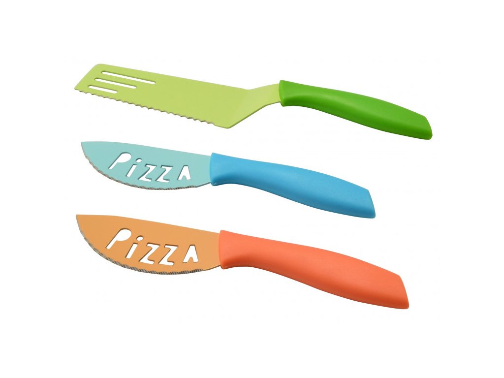 Sada pozostáva z dvoch nožov, ktoré sa používajú na krájanie pizze a jednej naberačky, ktorá je určená na krájanie a servírovanie pizze. Nože sú vyrobené z nerezovej ocele s plastovou rukoväťou a sú pokryté antibakteriálnym povrchom. Obsah balenia: 1 modrý nôž, 1 oranžový nôž, 1 zelená naberačka Materiál: nerezová oceľ, plast Dĺžka nožov: 19,5 cm Dĺžka naberačky: 25 cm Váha: 255 gDodatočné parametre