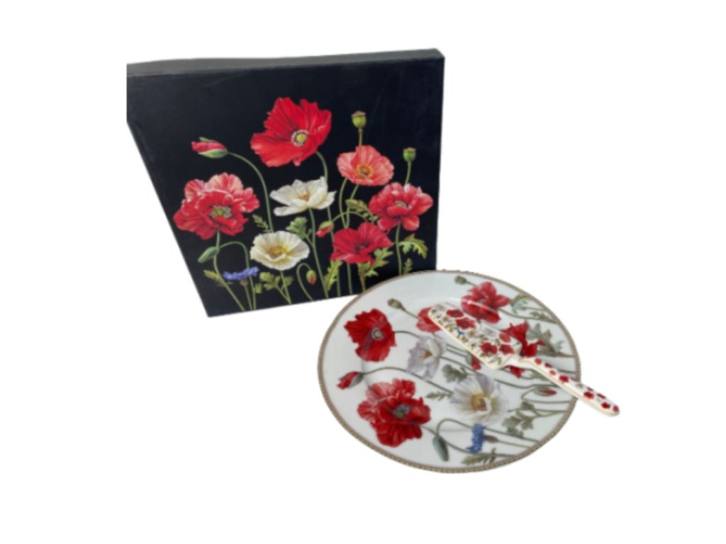 Tanier s lopatkou na servírovanie torty alebo iných pokrmov. Tanier má pekný dizajn makov na bielom podklade.
