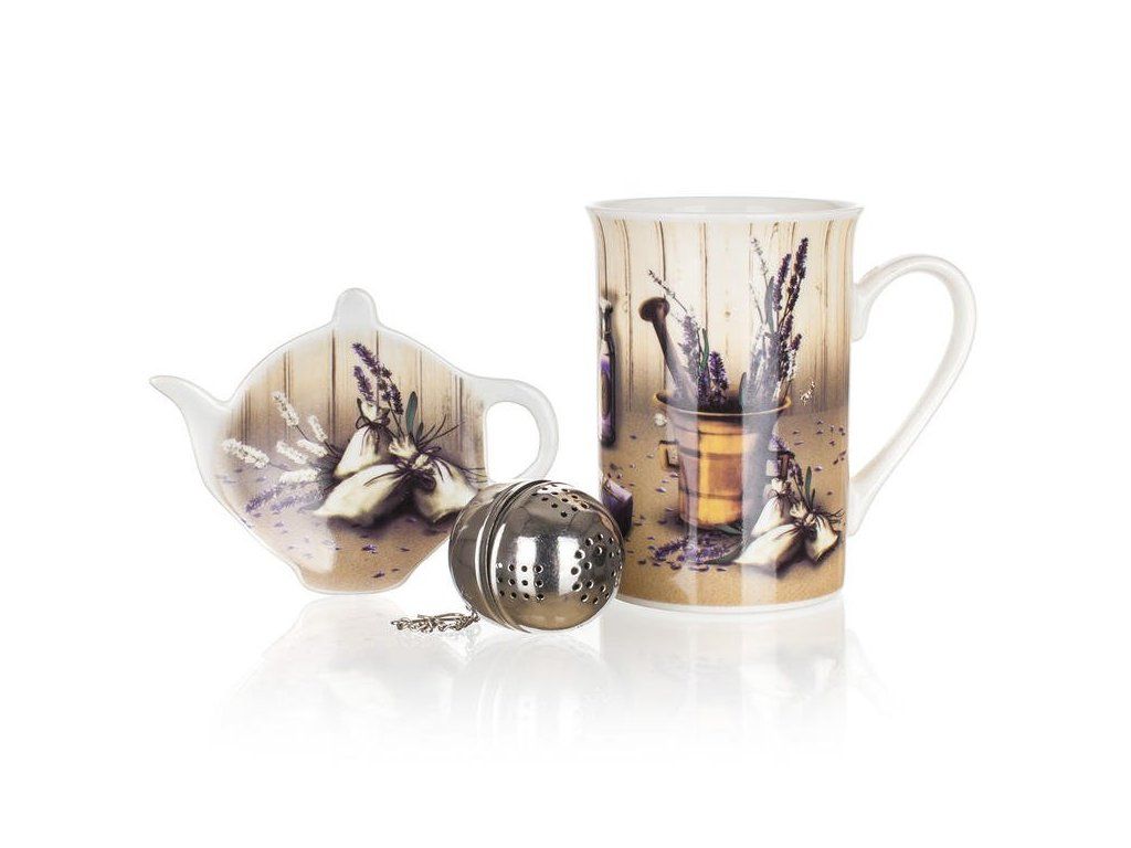 Čajová sada z obľúbenej kolekcie Lavender sa hodí do každej kuchyne. Sada obsahuje keramický hrnček, kovové sitko a odkladaciu tácku. Sada je vyrobená z kvalitnej keramiky a kovu. Vychutnajte si atmosféru slnečnej Provence. Obľúbená kolekcia Lavender prinesie vôňu levandule priamo do vašej kuchyne. Celú kolekciu Lavender nájdete TU . Materiál: keramika, sitko - nerez oceľ Rozmery: hrnček - objem 340 ml, priemer. 7,5 cm x výška. 10,4 cm Váha: 360 gDodatočné parametre