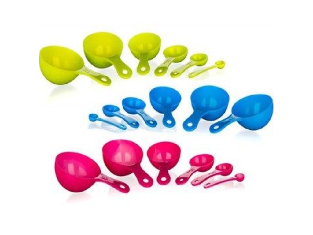 Sada plastových odmeriek obsahuje 6 ks odmeriek v objeme 1, 5, 10, 15, 50, 100, 125 ml. Využívajú sa pri dávkovaní potravín alebo pri príprave rôznych pokrmov. Odmerky sú vyrobené z plastu.