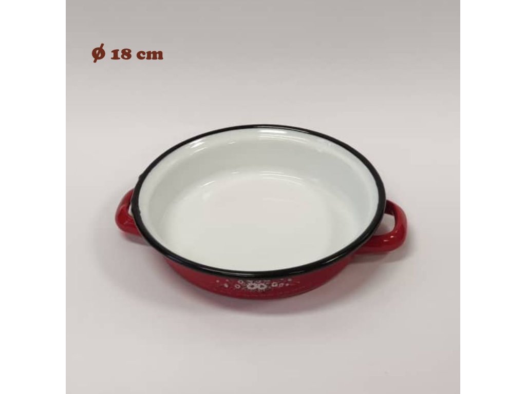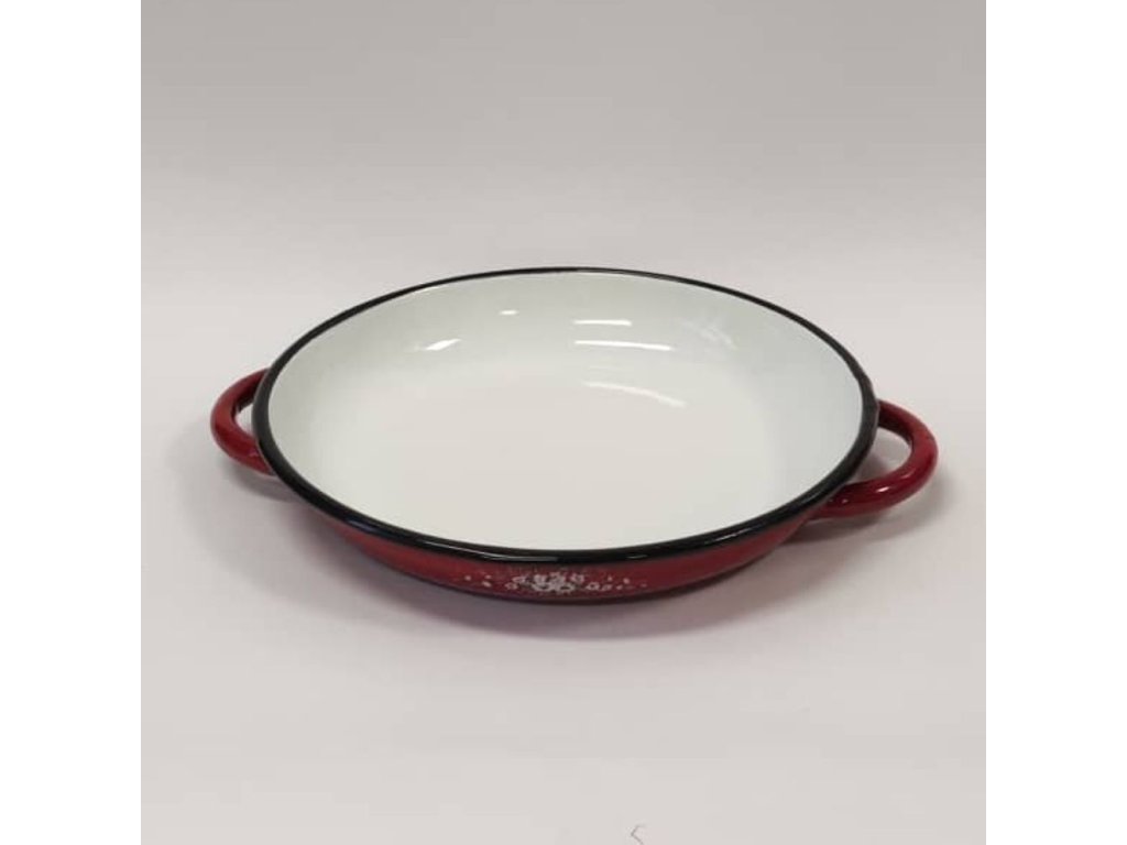 Okrúhly hlboký smaltovaný tanierik červenej a bielej farby s čiernym okrajom s priemerom 20 cm využijete pri servírovaní polievok alebo omáčok.