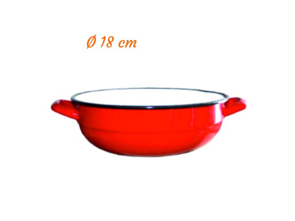 Okrúhly hlboký smaltovaný tanierik červenej a bielej farby s čiernym okrajom s priemerom 20 cm využijete pri servírovaní polievok alebo omáčok.
