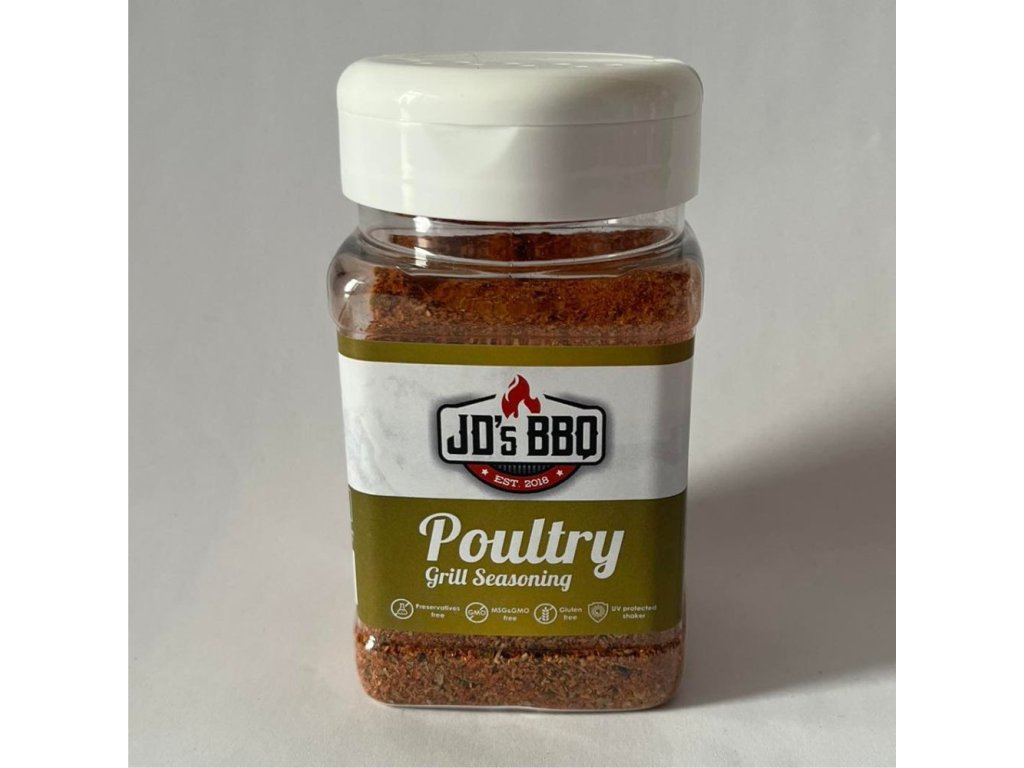 Korenie POULTRY určené predovšetkým na hydinu. S týmto korením zaručene pripravíte to najchutnejšie grilované kurča. Vďaka zelenému koreniu je korenie vhodné aj pri príprave šalátov a chutných ľahkých dresingov. Výborne sa hodí aj na grilovanie zeleniny. Vďaka praktickej koreničke je manipulácia pri korenení jednoduchšia. Zloženie: soľ, cesnak, paprika, čierne korenie, cukor, paradajkový prášok, biele korenie, zázvor, rozmarín, oregano, petržlen, majoránka Výživové údaje v 100 g koreninovej zmesi Poultry: Energetická hodnota - KJ:602,8 Energetická hodnota - Kcal: 150,5, Tuky: 2,6 g - z toho nasýtené mastné kyseliny: 0,1 g, Sacharidy: 31,7 g - z toho cukry: 8,6 g, Bielkoviny: 5 g, Soľ: 50 g Netto hmotnosť: 200 g . Značka JD´s BBQ vznikla v roku 2018 a spája sa v nej láska k BBQ, odhodlanie, chuť napredovať a učiť sa nové veci. Nápad vytvoriť kvalitné BBQ zmesi a ruby z prémiových prísad vznikol vďaka BBQ fanatizmu a tradičnej, 30-ročnej rodinnej firme na výrobu korenín. Garanciou vysokej kvality je zmes stopercentne maďarskej, prvotriednej červenej papriky z mesta Segedín, zmes čierneho, zeleného a ružového korenia z Brazílie a Vietnamu a ostatné prémiové prísady. V koreninových zmesiach nenájdete zvýrazňovače chutí, konzervanty, emulgátory ani iné pridané látky. Koreninové zmesi sú vyrábané ručne, o čom svedčí aj to, že čierne korenie sa melie ručným mlynčekom a následne sa starostlivo preoseje, aby sa do zmesi dostali iba tie najlepšie kúsky.