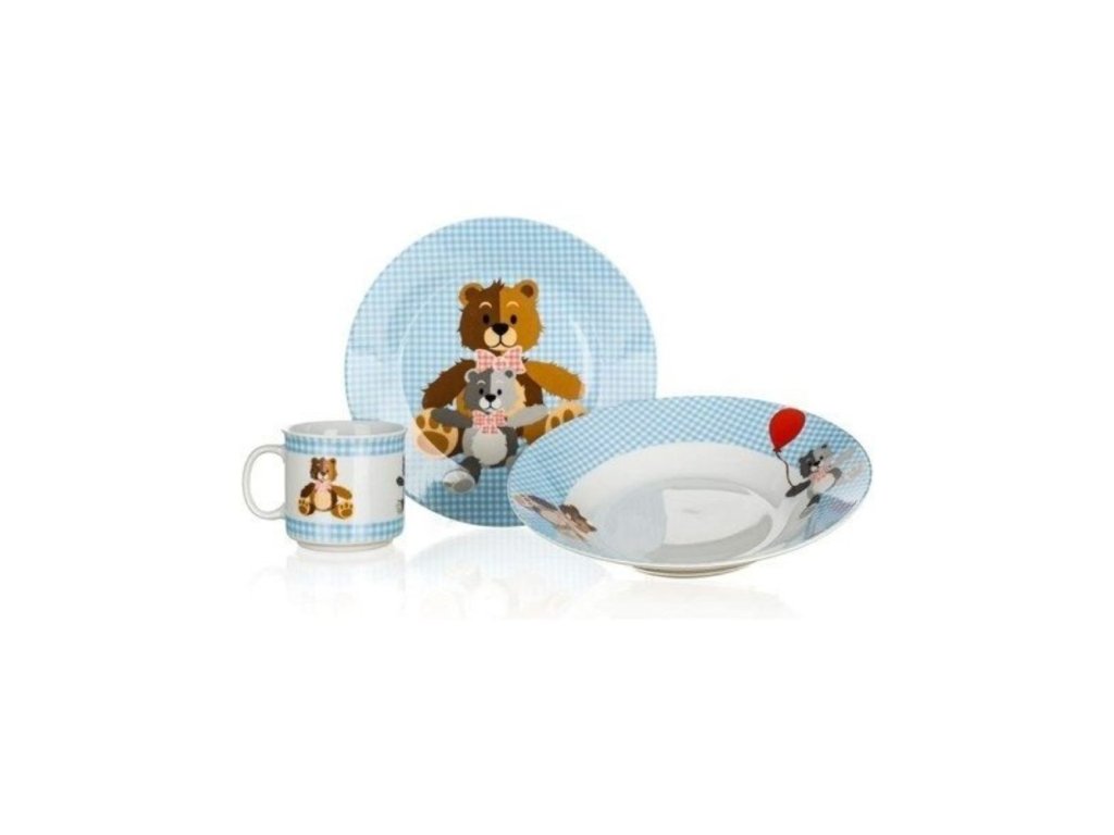 3 dielna detská súprava s motívom zvieratiek obsahuje 1 plytký tanierik s priemerom 21 cm , 1 hlboký tanierik s priemerom 20 cm a 1 hrnček s objemom 210 ml. Materiál: keramika